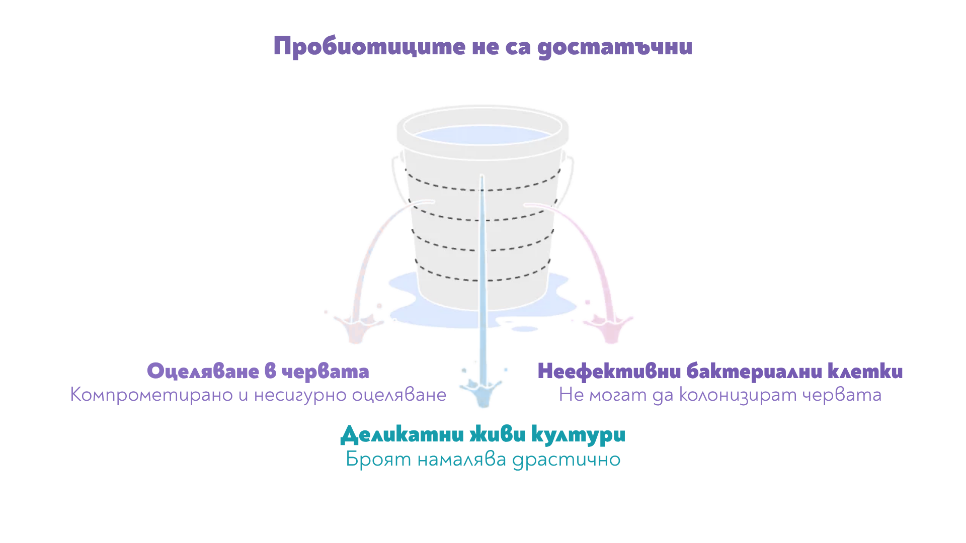 Пробиотиците, по дефиниция, са живи микроорганизми, които, приети в адекватни количества, носят ползи за здравето на гостоприемника. Проблемът е, че тяхната ефективност зависи изцяло от оцеляването им по пътя до червата, което често е компрометирано и силно несигурно. Тези живи култури са деликатни. Дори продуктът да напусне фабриката с 10 милиарда живи бактерии, докато стигне до вас и премине през стомашната ви киселина, броят им може да е драстично намалял. Много от стандартните пробиотици на пазара са по същество „мъртви при пристигането си“. Вие плащате за живи култури, но получавате неефективни бактериални клетки, които не могат да колонизират червата ви или да произведат полезните вещества, от които се нуждаете.