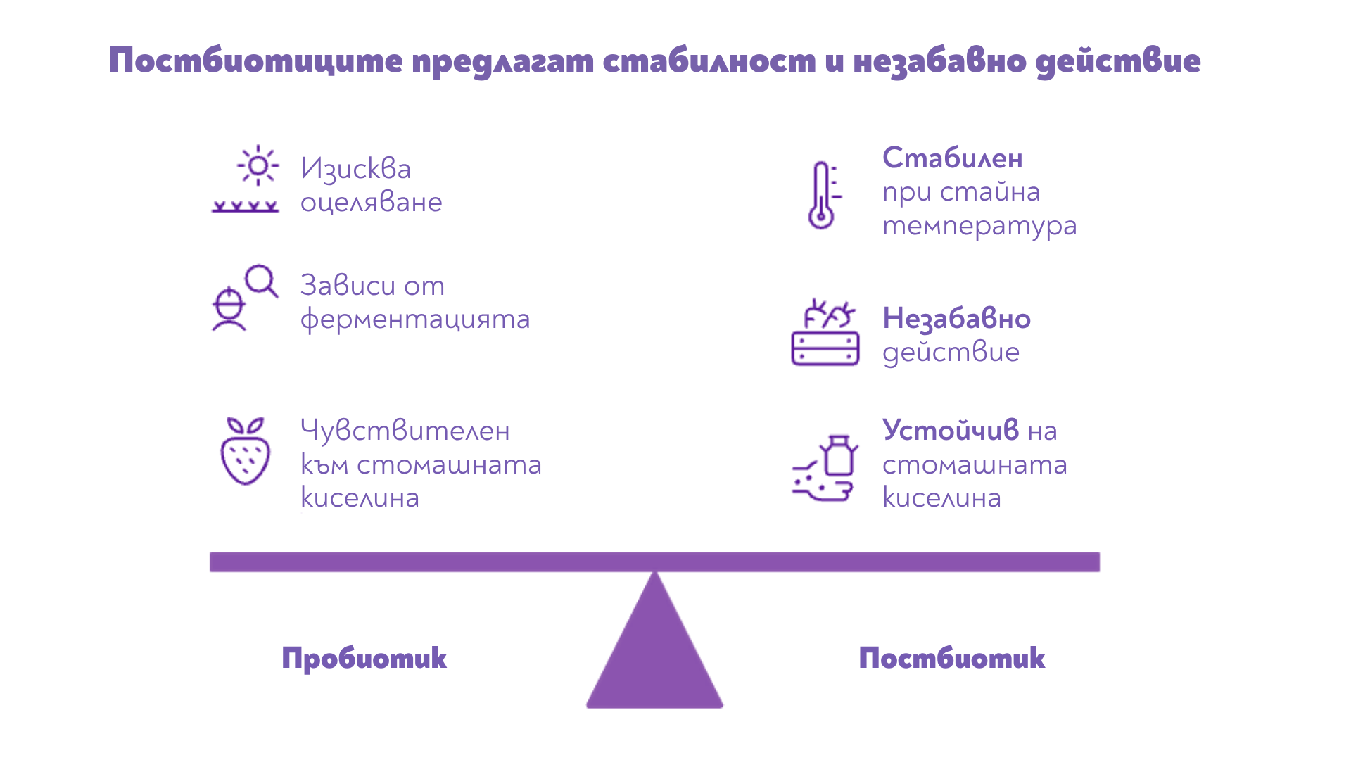 Основните предимства на постбиотика са неговата изключителна стабилност, по-бързото действие и значително по-добрата поносимост. Те елиминират несигурността от уравнението. Тъй като не са живи, те не изискват специално съхранение в хладилник и не носят риск от бактериален свръхрастеж (SIBO).