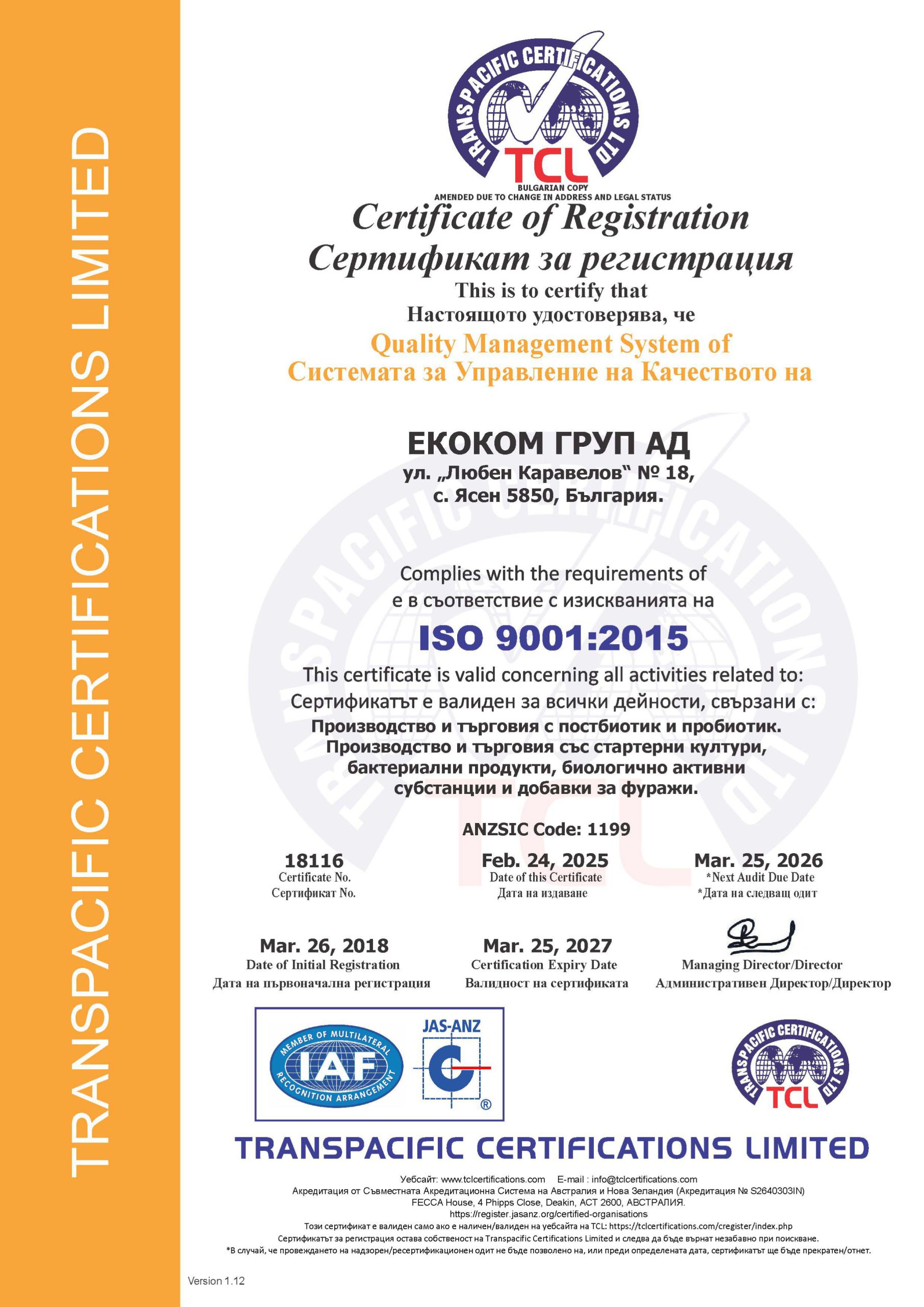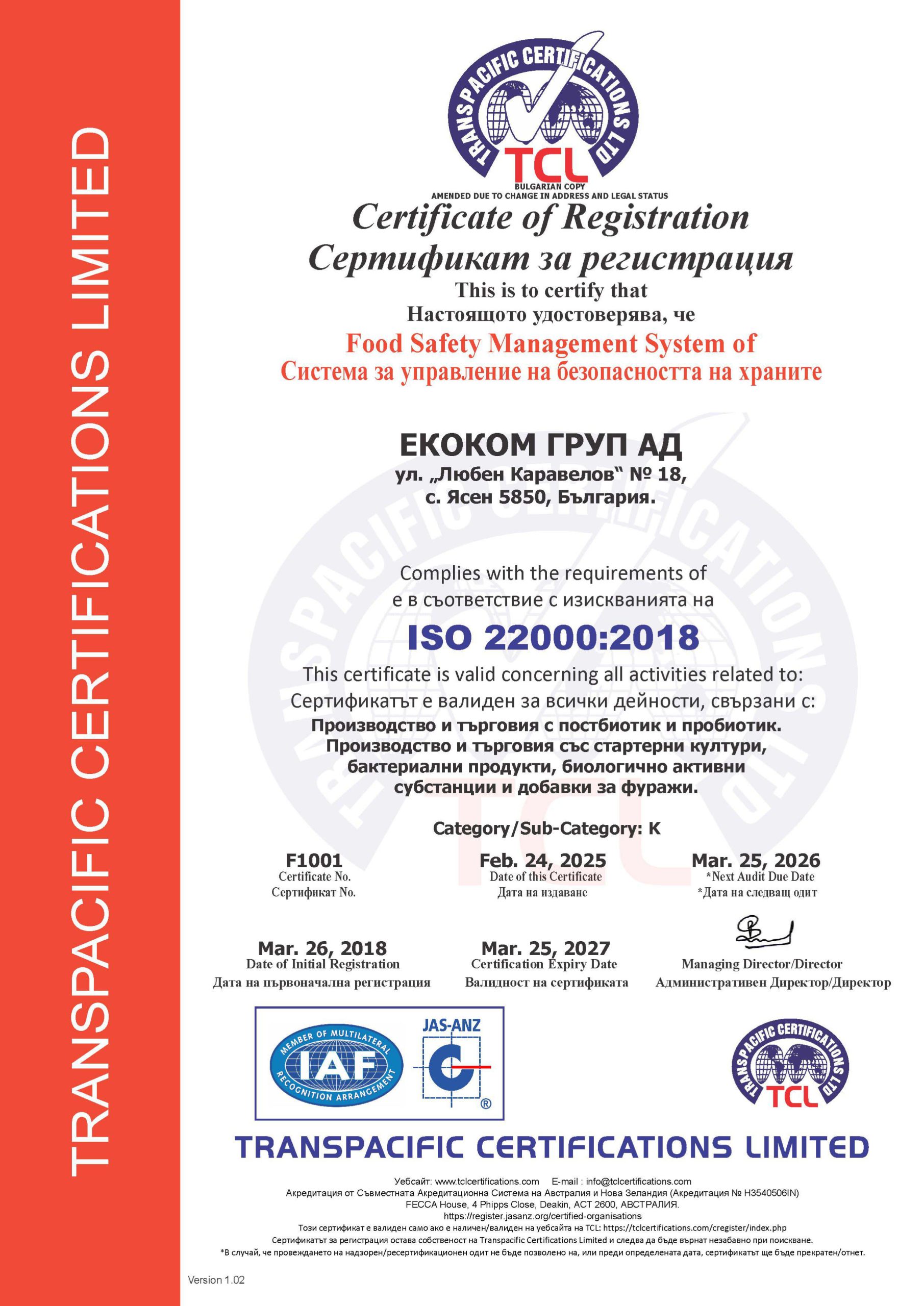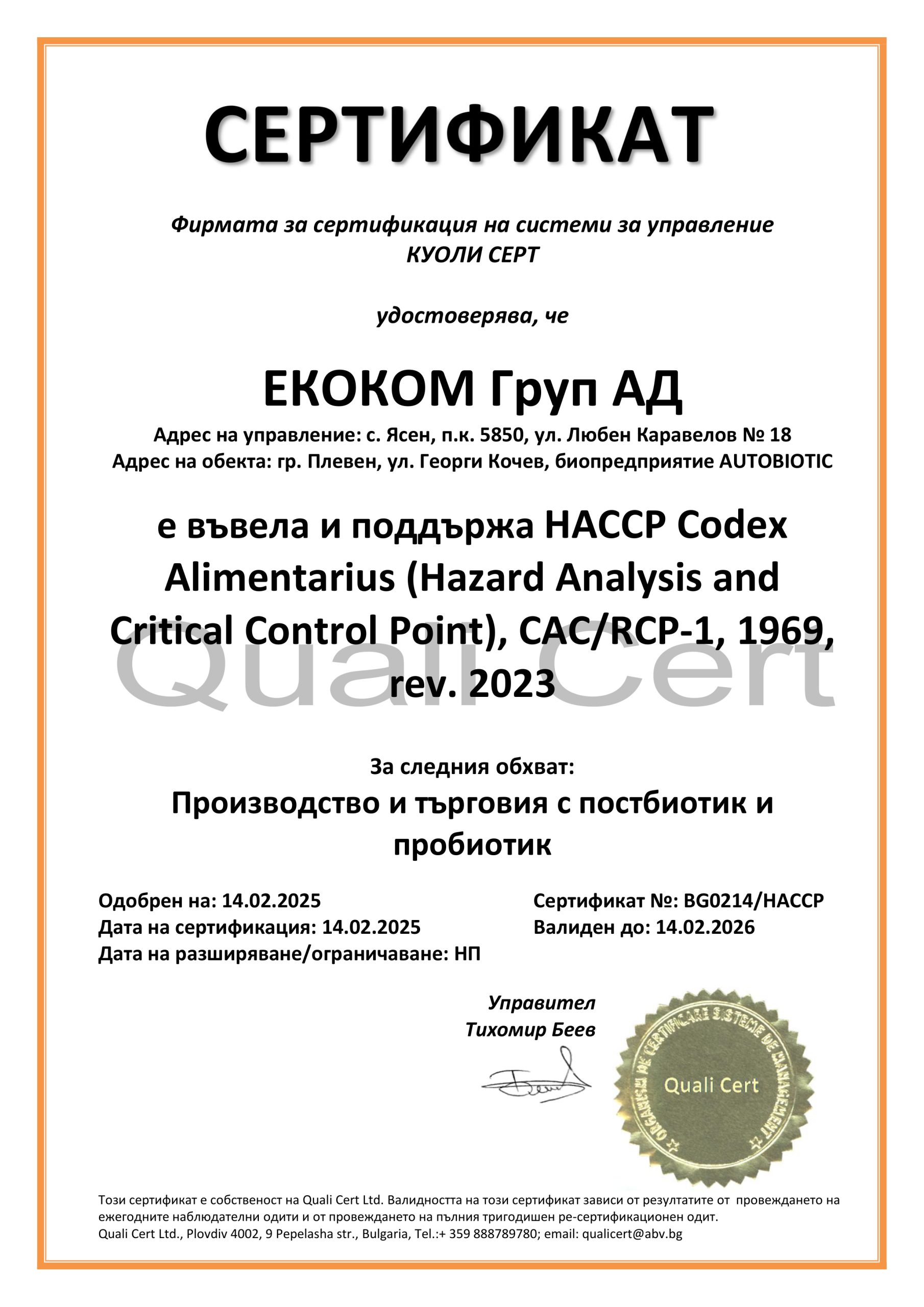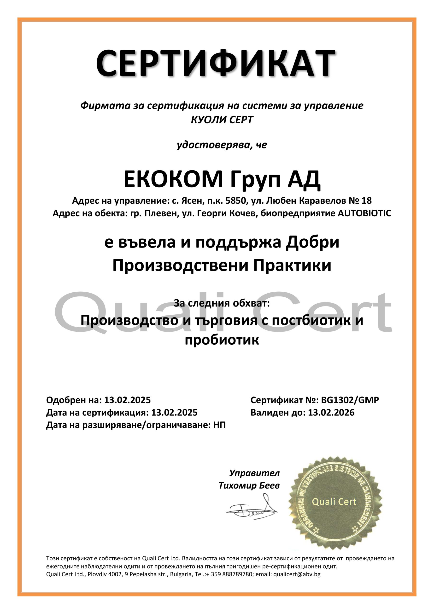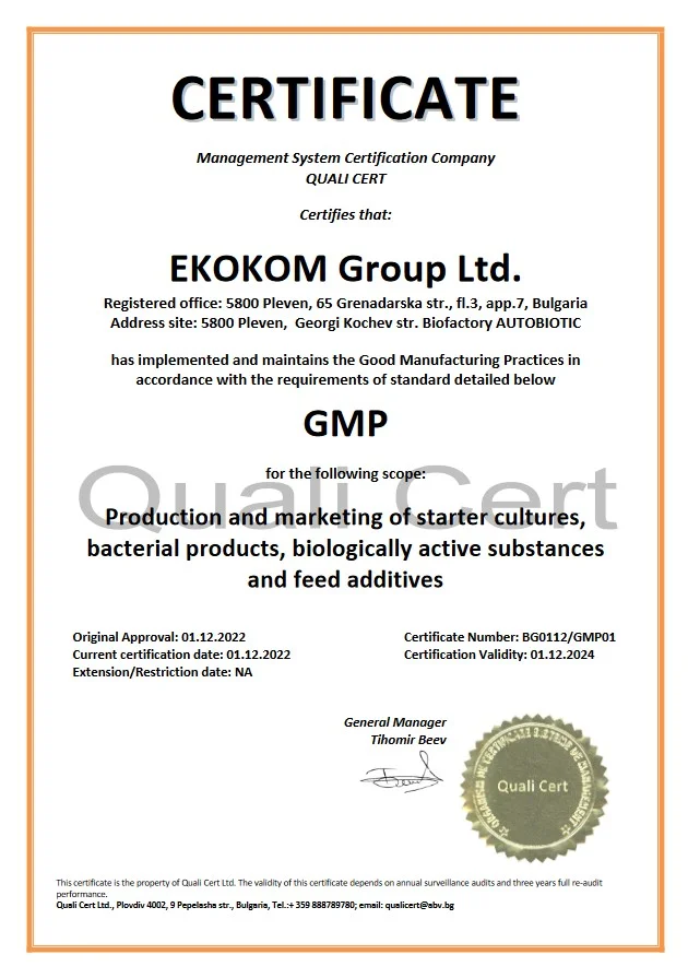 Разработени са различни иновативни биотехнологични методи за производство на ново поколение пробиотични препарати. Произвеждат се 100% натурални, естествени и висококачествени продукти без консерванти,стабилизатори, ГМО и други. Предприятието е сертифицарано по ISO9001; ISO22000; HACCP и GMP. Продуктите отговарят на всички европейски стандарти, както и притежават сертификати Halal и Kosher