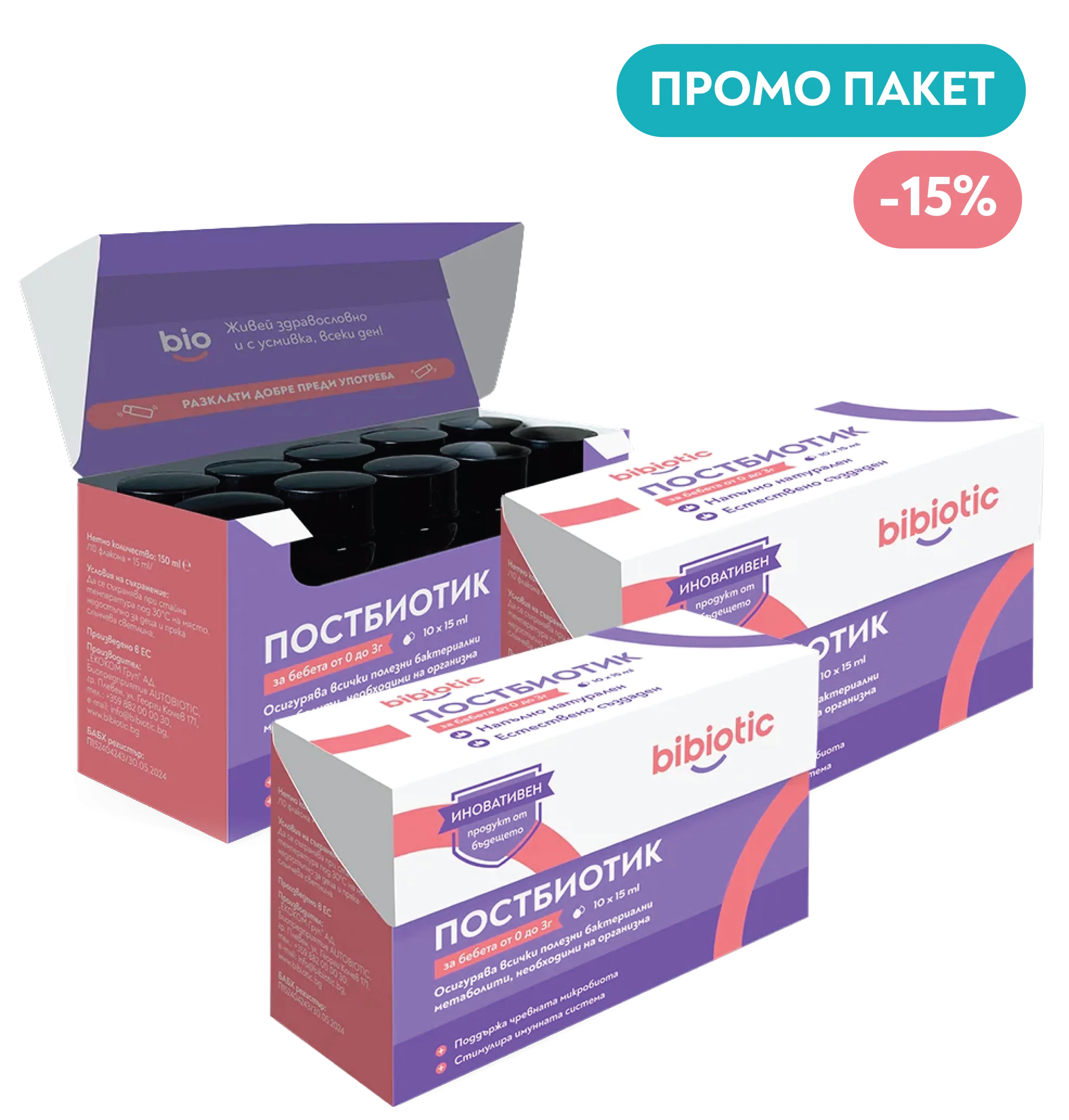 Bibiotic® за бебета (0-3г.) е постбиотична хранителна добавка, създадена да подпомага естествения баланс на чревната микрофлора и да осигурява комфорт на бебето още от първите седмици. Формулата спомага за облекчаване на колики, намаляване на газове и подуване, и същевременно подкрепя развитието на здрава имунна система. Промо пакетът предлага по-дългосрочно решение за поддържане на стабилен чревен баланс и добро храносмилане при бебета и малки деца до 3-годишна възраст.