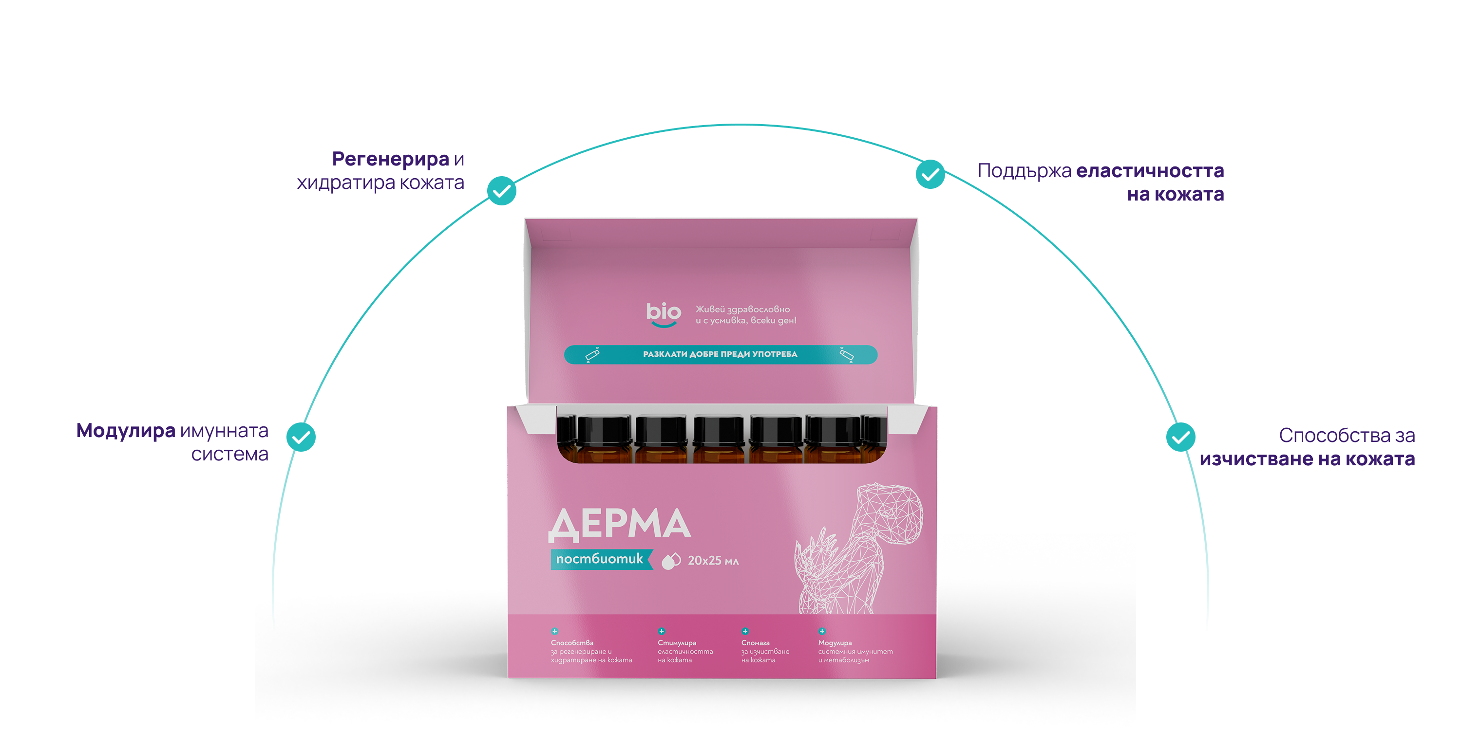 Постбиотикът „Bibiotic®Дерма“ се справя не само с локалните симптоми, но и с основните причини за сухота и дехидратация на кожата. Възпалението е една от основните причини за сухота и дехидратация на кожата, защото нарушава бариерната ѝ функция и води до загуба на влага. Модулирайки имунната система, Bibiotic®Дерма отстранява системното възпаление, с което допринася за здравословна кожна среда и разрешаване на проблема. Освен това, Bibiotic®Дерма стимулира производството на натурални овлажняващи фактори (nmfs) в кожата, като хиалуронова киселина. Тези фактори привличат и задържат влагата, подобрявайки хидратацията.