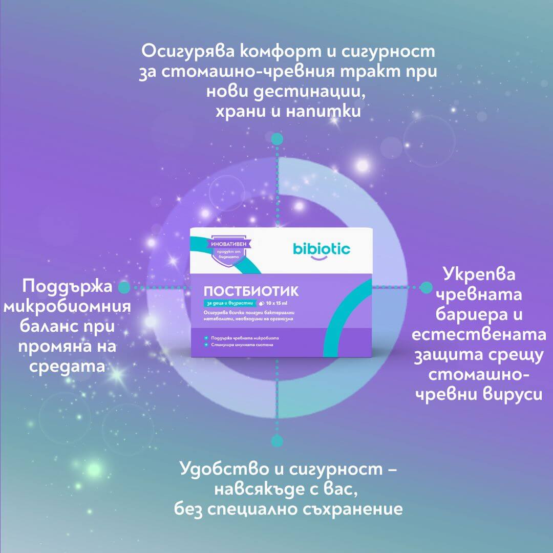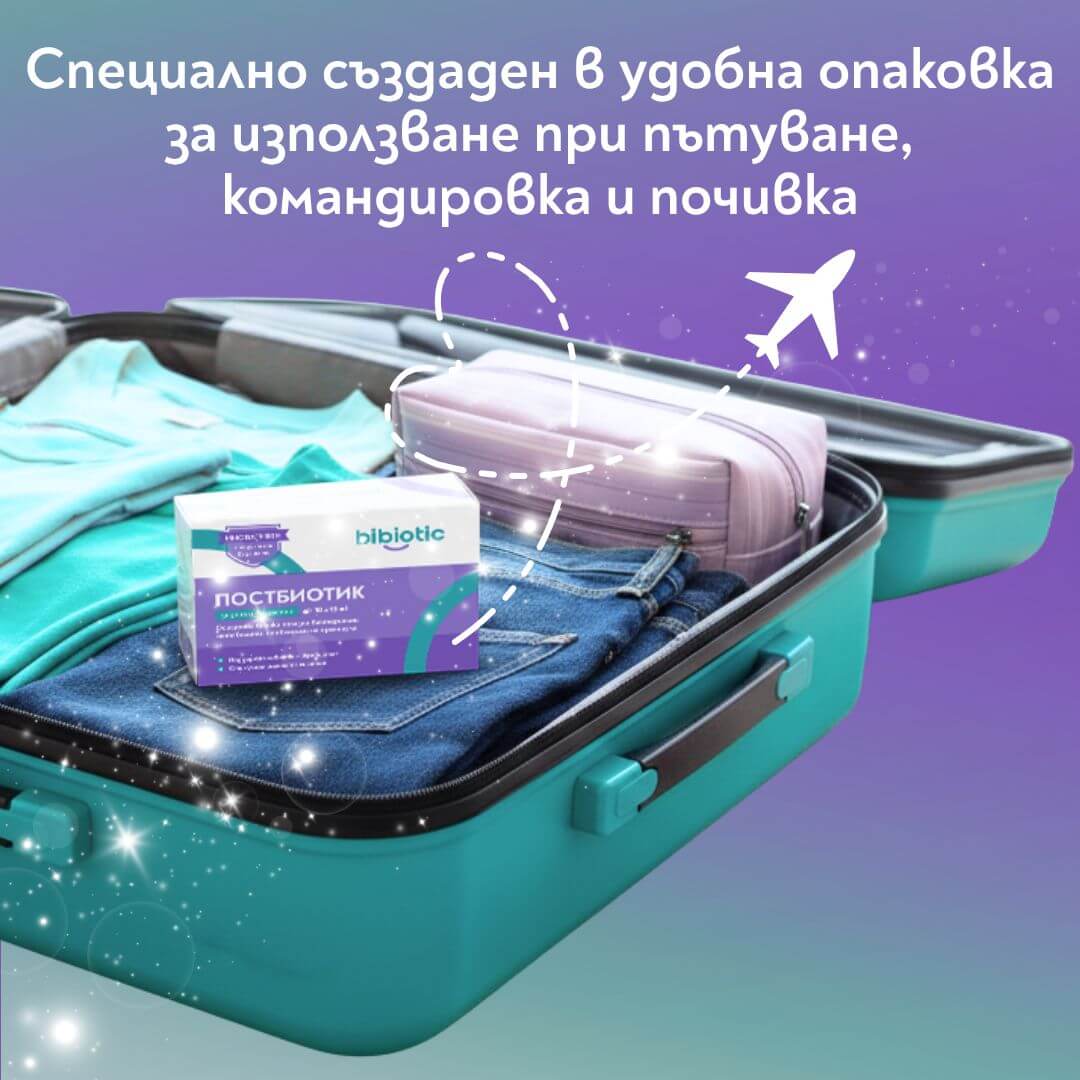 При пътуване организмът е изправен пред рязка промяна на средата, а храносмилателната система често реагира първа. Смяната на храната, дневния режим и климата може да наруши чревния баланс и да доведе до подуване, диария или общ стомашен дискомфорт. Bibiotic® за деца и възрастни подпомага именно този преходен период, като осигурява бърза и стабилна подкрепа без нужда от адаптация, характерна за продуктите с живи бактерии като пробиотиците. Готовите постбиотични метаболити подпомагат нормалната функция на храносмилателната система при контакт с непознати храни, различни мазнини, подправки и микроорганизми, като ограничават условията за развитие на нежелани бактерии. При смяна на локацията и контакт с нова вода или сурови храни Bibiotic® за деца и възрастни подпомага целостта на чревната бариера и затруднява преминаването на токсини и патогени в организма. Едновременно с това той спомага за поддържане на стабилна чревна среда при нередовно хранене, смяна на часови пояси и липса на рутинен дневен ритъм. Климатичните промени, като жега, влажност или студ, също могат да окажат влияние върху чревната функция, а Bibiotic® за деца и възрастни подпомага адаптацията и комфорта на храносмилателната система. Благодарение на това, че не съдържа живи бактерии, продуктът действа веднага и остава ефективен, независимо от температурата и условията на пътуване, което го прави особено подходящ за travel употреба.